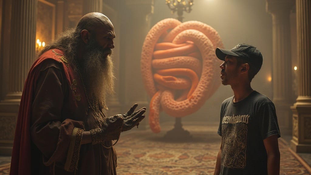 CULTIST ENCOUNTER Bjorn, a person of mixed heritage wearing brown robes with suspicious stains, carries a massive subwoofer on their back approaches Piston Oilcan...