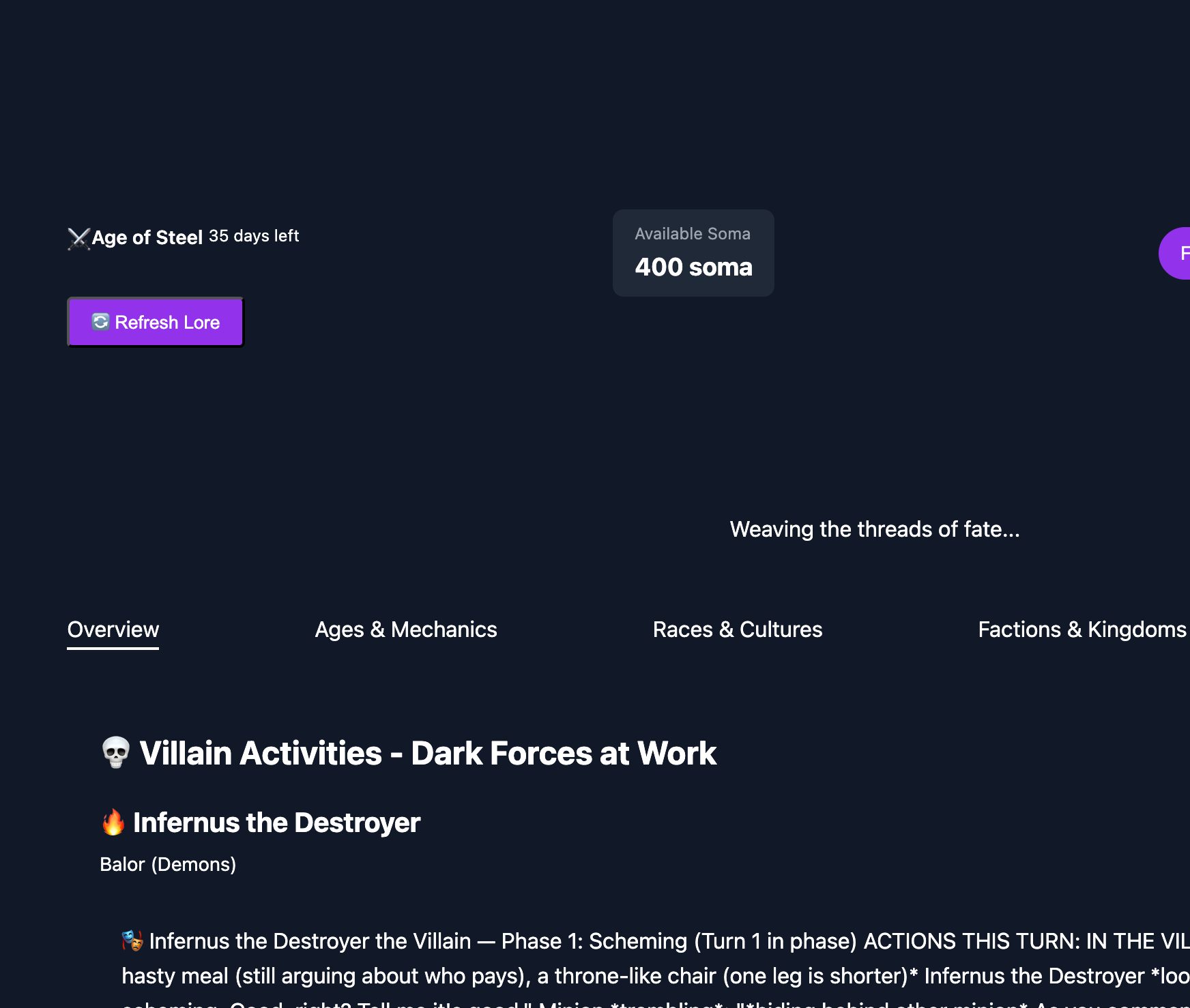 Revised both the villain turn reports (you can see them on the world-lore page, under overview, and the world-leader updates (again, under world-lore, under general events) to be more narrative rather than declarative. Will keep working on it, but the idea again is to a living, breathing world that feels real and full (and funny).